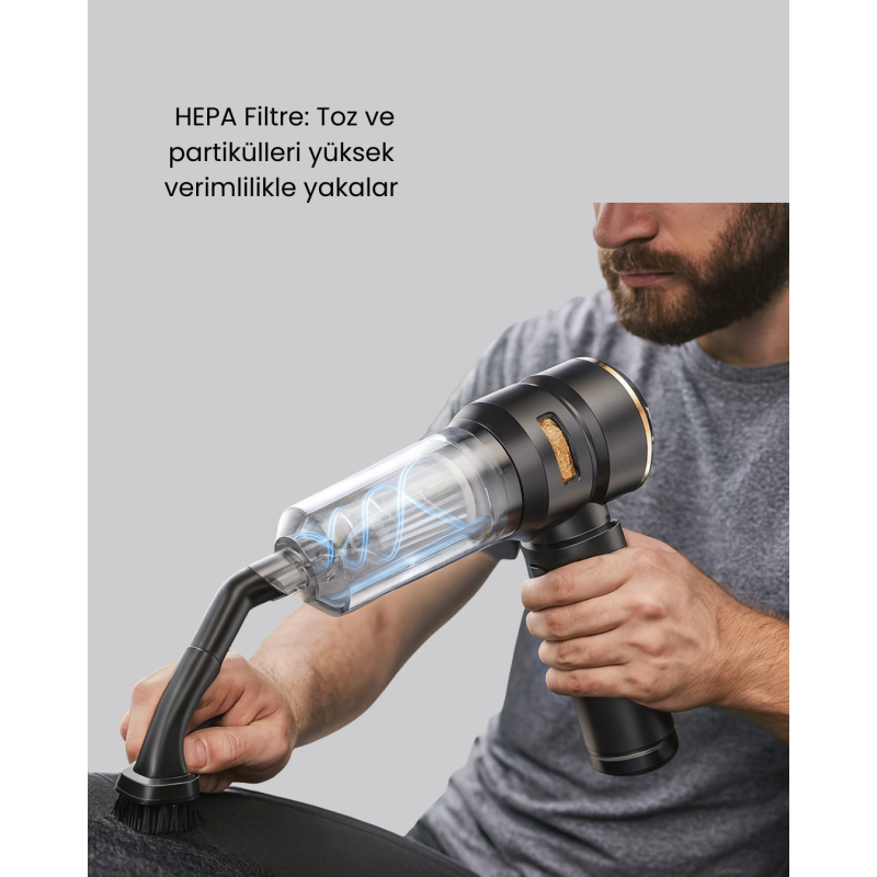 Araç içi ve küçük alan temizliklerinde profesyonel sonuçlar isteyenler için tasarlanmış bu şarjlı süpürge, güçlü performansı ve çok yönlü özellikleriyle öne çıkıyor. Kablosuz kullanım kolaylığı sayesinde priz derdi olmadan her yerde kullanılabilir. Maksimum 15.000 PA emiş gücü, en inatçı kirleri bile anında temizler. Üç kademeli emiş modu, temizlik ihtiyaçlarınıza göre özelleştirilebilir. Düşük mod hafif tozlar için, orta mod günlük kullanım için, yüksek mod ise derinlemesine temizlik için idealdir. Ayrıca üfleme modu sayesinde sadece süpürmekle kalmaz, tozları ve partikülleri üfleyerek de temizleme olanağı sunar. HEPA filtre sistemi, tozları etkili bir şekilde hapsederek daha temiz bir hava sağlar. Yıkanabilir filtre özelliği ise hijyenik kullanımın yanı sıra uzun ömürlü performans sunar. Kompakt ve hafif yapısıyla kolayca taşınabilir, ergonomik tutma kolu ise uzun süreli kullanımda konfor sağlar. Düşük gürültü seviyesiyle sessiz çalışan bu süpürge, her ortamda rahatlıkla kullanılabilir. Farklı başlık seçenekleriyle dar alanlardan hassas yüzeylere kadar her yüzeyde etkili sonuç verir. Araç içi detaylı temizlik için ideal olan bu ürün, evinizde küçük alanlarda da pratik bir temizlik imkânı sunar.