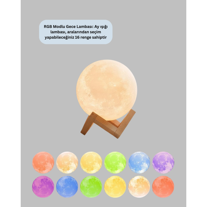 Evinize gökyüzünün huzurunu taşıyın! 16 renkli 3D baskılı ay lambası, gerçek ay yüzeyinden esinlenilerek tasarlanmış hiper gerçekçi yüzeyiyle hem dekoratif hem de fonksiyonel bir aydınlatma çözümüdür. NASA verilerine dayalı 3D baskı teknolojisi, ayın tüm krater detaylarını birebir yansıtarak benzersiz bir görsel şölen sunar.Lambanın 16 farklı renk seçeneği ve 4 özel ışık modu (, solma, geçiş, sabit) bulunur. Dilediğiniz renkte romantik bir atmosfer yaratabilir veya RGB geçiş moduyla odanıza canlılık katabilirsiniz. 9 kademeli parlaklık ayarı, hem gece lambası olarak hem de ambiyans ışığı olarak kullanımı mümkün kılar.Şık ahşap standı, doğal dokusuyla sıcak bir görünüm sunarken, modern dekorlarla mükemmel uyum sağlar.Şarjlı bataryası, 8 saate kadar kesintisiz kullanım sağlar. Type-C şarj girişi ile sadece 2 saatte tam dolum yapılabilir. Hafif ve taşınabilir yapısı sayesinde ister yatak odasında ister salonda ya da çocuk odasında rahatlıkla kullanılabilir.Romantik bir akşam, huzurlu bir uyku ortamı veya şık bir hediye için mükemmel bir tercih!