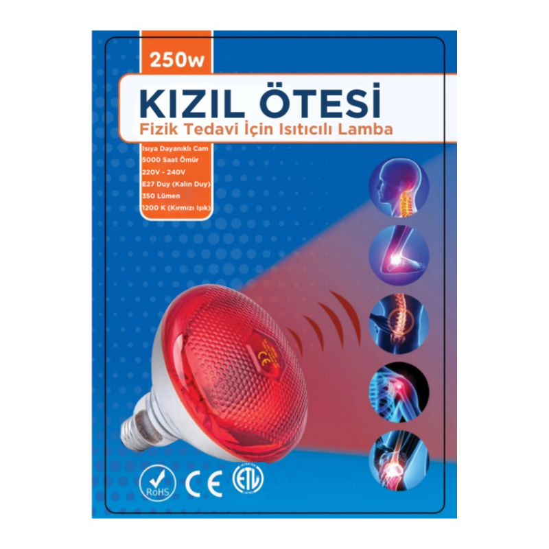 250W kızılötesi (infrared) ısıtıcı lamba, fizik tedavi, sağlık, kurutma ve alan ısıtma uygulamaları için tasarlanmıştır. E27 kalın duy ile kolayca monte edilir. Yüksek ısı verme özelliği sayesinde küçük alanlarda sobaya gerek kalmadan etkili ısınma sağlar.