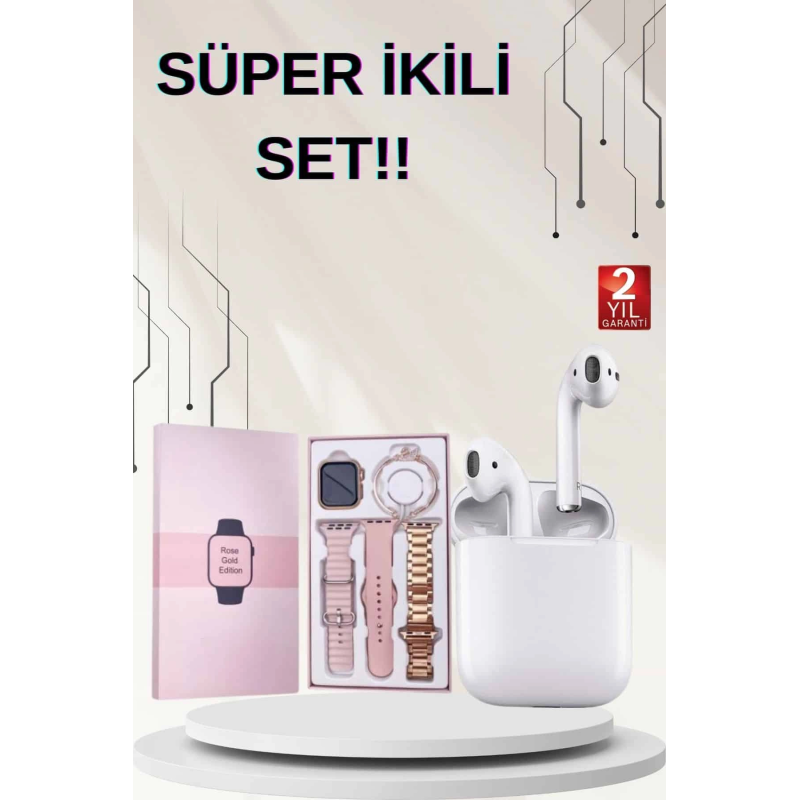 AKILLI SAATYeni Nesil Mini Kadın Akıllı Saat, şıklığı ve fonksiyonelliği bir araya getiren tasarımıyla kadınlar için ideal bir seçenek sunuyor. Almanya üretimi ultra dayanıklı model, özel wireless şarj özellikleriyle öne çıkıyor ve Türkçe menüsü sayesinde kullanıcı dostudur. Kutu içeriğinde, mini akıllı saat, 3 farklı kordon, hediye bileklik, wireless şarj kablosu ve kullanım kılavuzu bulunmaktadır. Şık pembe kutusu, hediye olarak tercih edilmesini sağlayan bir özellik taşır. 41 mm kavisli oval kenarlı yeni tasarımı ve 1,70 inç AMOLED ekranı ile yüksek çözünürlükte HD görüntü sağlar.Saat, nabız ölçer, uyku izleyici, kan basıncı, tansiyon, EKG ve vücut sıcaklığı ölçer gibi sağlık izleme özellikleriyle sağlığınızı takip etmenizi sağlar. 117 farklı spor modu ve adım, kalori, kalp ritmi ölçme gibi özellikler ile aktivite takibini oldukça detaylı yapabilirsiniz. Ayrıca akıllı hatırlatıcılar sayesinde su içme ve hareketsizlik gibi hatırlatmalar alabilir, tüm bildirimleri ve mesajları anında saatinizde görebilirsiniz.Bluetooth bağlantısı ile yüksek kaliteli müzik dinleyebilir ve uzaktan fotoğraf çekme özelliği ile fotoğraflarınızı kolayca çekebilirsiniz. Suya dayanıklı yapısı, günlük kullanımda sıklıkla tercih edilmesini sağlar; ancak deniz ve havuz gibi basınçlı suya karşı su geçirmez.Saatin sunduğu diğer özellikler arasında Türkçe ve çoklu dil desteği, saatimi bul, telefonumu bul, alarm, kronometre, hava durumu, hesap makinesi gibi fonksiyonlar bulunur. Kordonu değiştirilebilir, bu sayede kişisel tercihlere göre tasarımı özelleştirilebilir. 24 ay garanti süresi ile kullanıcılarına güvenli bir deneyim sunar.KULAKLIK2.Nesil kulak içi Bluetooth kulaklık, ergonomik tasarımı sayesinde kulağa tam oturarak konforlu bir kullanım sunar. Alerji yapmayan ve cildi tahriş etmeyen yapısı ile uzun süreli kullanımda bile rahatlık sağlar. iOS ve Mac ile tam uyumlu olup, dokunmatik sensörleri sayesinde müzik geçişlerini ve çağrı kontrollerini kolayca yapmanıza olanak tanır. Güçlü pil ömrü ile uzun süreli kullanım sunarken, gürültü önleyici özelliği sayesinde dış mekanda yapılan konuşmalarda net bir ses aktarımı sağlar. Hassas mikrofonu, uzak mesafeden gelen sesleri bile algılayarak kesintisiz iletişim imkanı sunar. Suya ve toza dayanıklı yapısı sayesinde günlük kullanımda dayanıklılık gösterir. Şık beyaz tasarımıyla dikkat çeken bu model, İOS cihazlarla sorunsuz bir şekilde eşleşerek kaliteli bir kablosuz deneyim yaşatır.