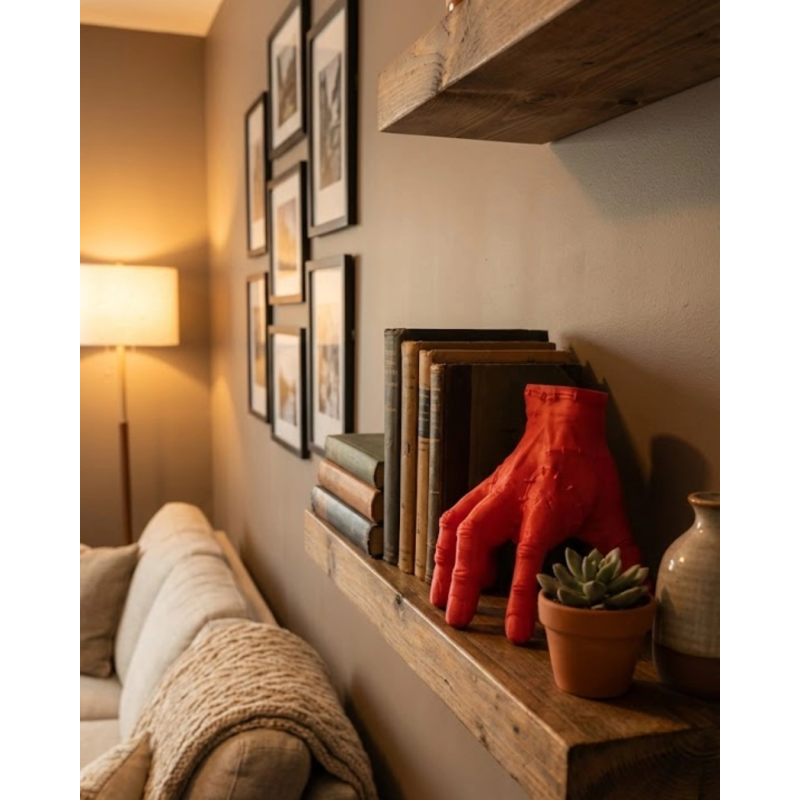 3D Dekoratif Kırmızı El Biblo, yaşam alanlarına cesur, modern ve dikkat çekici bir atmosfer kazandırmak isteyenler için özel olarak tasarlanmış es bir dekorasyon ürünüdür. 17x16 cm ölçüsü sayesinde ne çok büyük ne de küçük; tam kararında bir “statement piece” olarak bulunduğu ortamda güçlü bir odak noktası oluşturur.Canlı kırmızı rengi ile enerjik, iddialı ve sanatsal bir görünüm sunar. Raf, kitaplık, masa, konsol, TV ünitesi, şömine üstü veya komodin üzerinde rahatlıkla kullanılabilir. Minimal dekorasyona kontrast katmak isteyenler için güçlü bir tamamlayıcıdır.3D tasarım detayları sayesinde yüzey kıvrımları ve dikiş efektleri oldukça gerçekçi bir görünüm sunar. Modern, gotik, endüstriyel veya alternatif dekorasyon stilleriyle uyum sağlar.Ev dekorasyonu dışında ofis masasında, çalışma odasında veya sanat köşelerinde de kullanılabilir. Farklı ve karakterli bir obje arayanlar için ideal bir seçimdir.