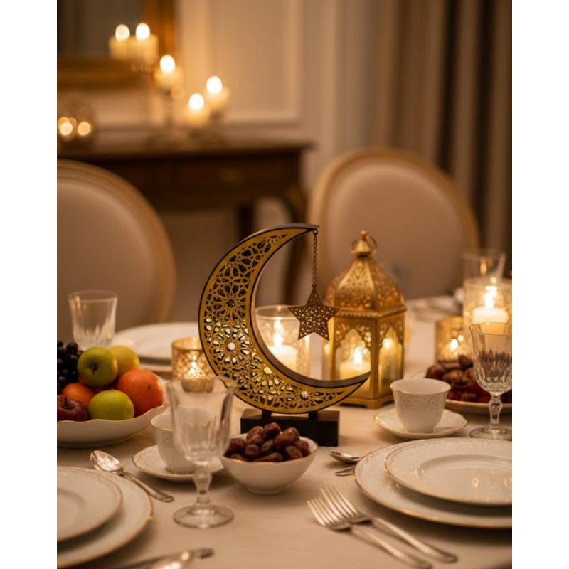 3D Hilal Yıldız Biblo 23x23 cm, zarif tasarımı ve es detaylarıyla bulunduğu ortamda sıcak ve huzurlu bir atmosfer oluşturur. Hilal figürü, kültürel ve manevi anlamı ile dekorasyona derinlik katar.23x23 cm ölçüsü sayesinde masa üstünde fazla yer kaplamadan dikkat çeker. Özellikle iftar sofralarında orta süs olarak kullanıldığında şık bir konsept oluşturur.Altın tonlu detaylar ışıkla birleştiğinde yumuşak bir yansıma sağlar. Bu sayede akşam saatlerinde daha etkileyici bir görünüm sunar.Modern ve geleneksel dekorasyon anlayışını bir arada buluşturan özgün bir tasarım ürünüdür.
