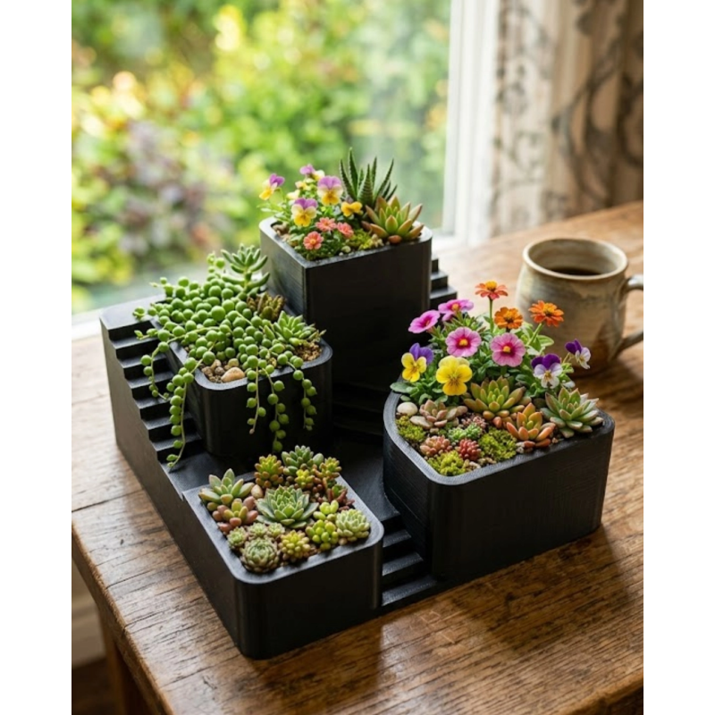 3D kaktüs saksı seti, modern tasarımı ve çok bölmeli yapısıyla yaşam alanlarınıza es ve düzen kazandırmak için özel olarak tasarlanmıştır. Minimal çizgileri ve katmanlı formu sayesinde klasik saksılardan ayrılarak daha dikkat çekici bir görünüm sunar. Özellikle masaüstü dekorasyonunda fark yaratmak isteyen kullanıcılar için ideal bir üründür.Ürün, aynı anda birden fazla kaktüs veya sukulent bitkisini sergilemenize olanak tanır. Farklı boyutlardaki bölmeleri sayesinde bitkilerinizi düzenli bir şekilde yerleştirebilir, görsel olarak dengeli bir kompozisyon oluşturabilirsiniz. Bu özellik, hem es açıdan hem de kullanım kolaylığı açısından büyük avantaj sağlar.3D baskı teknolojisi ile üretilmiş olan saksı seti, dayanıklı ve uzun ömürlü bir yapıya sahiptir. Katmanlı yüzey dokusu, ürüne modern ve özgün bir karakter kazandırır. Aynı zamanda hafif yapısı sayesinde kolay taşınabilir ve farklı alanlarda rahatlıkla kullanılabilir.Ev, ofis, çalışma masası, kitaplık veya pencere önü gibi alanlarda kullanıma uygundur. Bitkilerin bulunduğu ortama kattığı doğal hava sayesinde daha huzurlu ve canlı bir atmosfer oluşturur. Küçük alanlar için ideal bir dekoratif çözümdür.Anahtar kelimeler: 3D saksı, kaktüs saksı seti, sukulent saksı, masaüstü dekor, dekoratif saksı