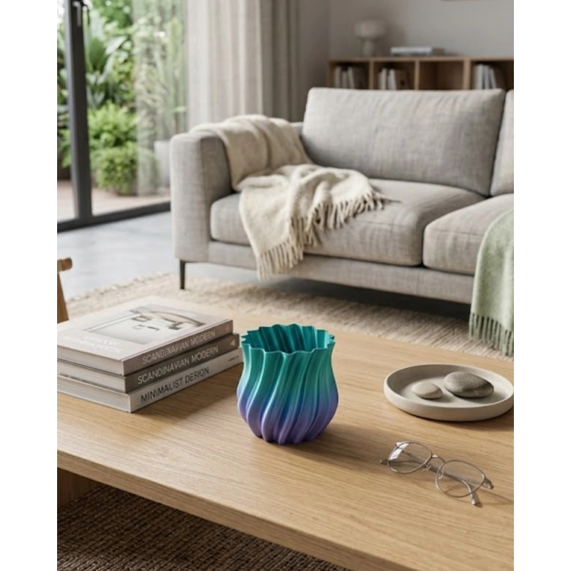 Modern dekorasyon anlayışını yansıtan 3D kıvrımlı mavi vazo, zarif tasarımı ve dikkat çekici renk geçişi ile yaşam alanlarınıza es bir dokunuş kazandırır. Mavi tonlarının derin ve sakinleştirici etkisi, bulunduğu ortama huzurlu bir atmosfer katarken aynı zamanda modern ve şık bir görünüm sunar. Özellikle minimal ve çağdaş dekorasyon tarzlarını benimseyenler için ideal bir tamamlayıcıdır.Ürünün dalgalı ve akışkan yüzey tasarımı, ışık ile etkileşime girerek farklı açılardan farklı tonlar oluşturur. Bu özellik, vazonun bulunduğu ortamda dinamik ve dikkat çekici bir görünüm kazanmasını sağlar. Gün ışığında daha parlak ve canlı bir etki sunarken, akşam saatlerinde daha sofistike ve yumuşak bir ambiyans oluşturur.Kompakt ve kullanışlı boyutu sayesinde küçük alanlarda bile rahatlıkla kullanılabilir. Sehpa, masa, kitaplık veya raf üzerinde konumlandırılarak dekorasyonunuzu tamamlar. Hafif yapısı sayesinde kolay taşınabilir ve farklı alanlarda rahatlıkla kullanılabilir.Bu vazo yalnızca çiçek yerleştirmek için değil, aynı zamanda tek başına dekoratif bir obje olarak da oldukça güçlü bir etki yaratır. Kurutulmuş çiçekler, pampas veya yapay bitkiler ile birlikte kullanıldığında görsel etkisi daha da artar. Aynı zamanda sosyal medya içerikleri ve es fotoğraf çekimleri için de oldukça uygundur.