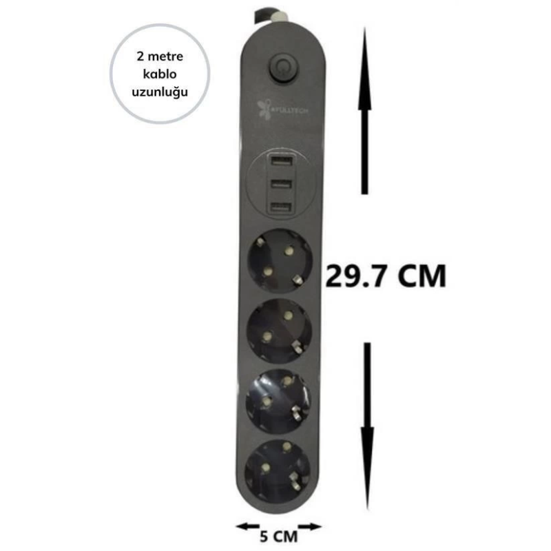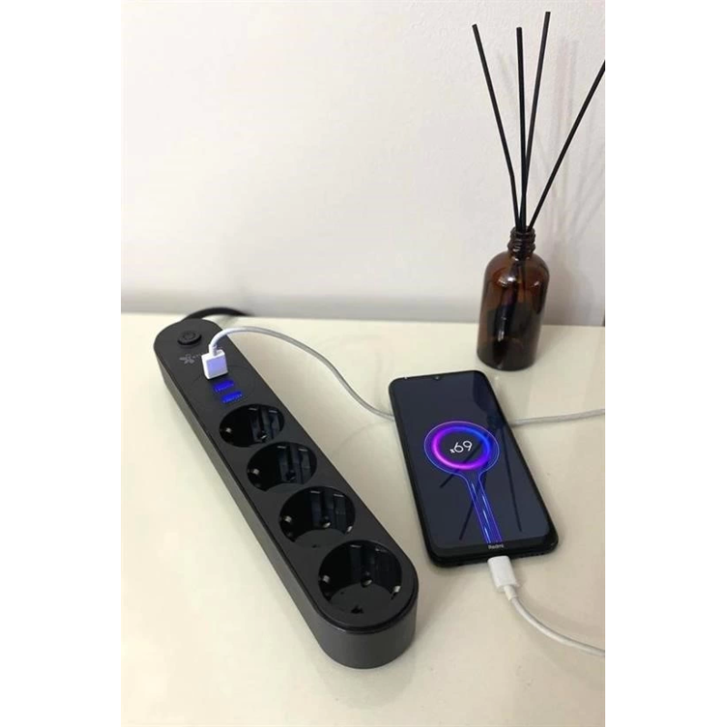 - 4'lü Siyah Anahtarlı 3 USB Li Akım Korumalı Topraklı Çocuk Korumalı Grup Priz 2 Metre
