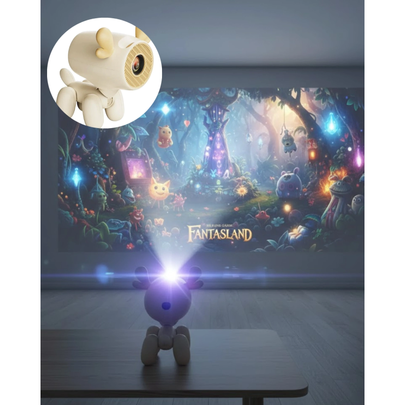 Geyik tasarımlı akıllı projeksiyon cihazı, es görünümü ve güçlü teknik özellikleri bir araya getiren modern bir ev eğlence çözümüdür. Sevimli ve kompakt form faktörü sayesinde çocuk odasından salona kadar her ortama uyum sağlar. Döner başlık tasarımı ve entegre stand yapısı sayesinde farklı açılarda konumlandırma imkanı sunar. Bu özellik, projeksiyonu duvara veya tavana kolayca yönlendirmeyi mümkün kılar.4K içerik desteği sayesinde yüksek çözünürlüklü medya dosyalarını sorunsuz şekilde oynatabilir. 500 ANSI lümen parlaklık değeri, net ve canlı görüntü performansı sunar. Bu sayede hem karanlık hem de yarı loş ortamlarda tatmin edici bir görüntü kalitesi elde edilir. Renkler canlı, detaylar keskin ve kontrast seviyesi dengelidir. Film, animasyon ve dizi içeriklerinde sürükleyici bir deneyim sağlar.Android tabanlı akıllı sistem sayesinde Netflix, YouTube ve benzeri popüler uygulamalara doğrudan erişim mümkündür. Harici bir medya oynatıcıya ihtiyaç duymadan internet üzerinden içerik izleyebilirsiniz. Dahili WiFi ve Bluetooth bağlantı özellikleri kablosuz kullanım kolaylığı sağlar. Ayrıca HDMI, USB ve TF kart girişleri ile geniş bağlantı seçenekleri sunar.36W gücünde dahili hoparlör sistemi ve Dolby Audio desteği sayesinde güçlü, temiz ve oda dolduran ses performansı sunar. Ekstra hoparlör ihtiyacı olmadan film ve müzik keyfi yaşatır.