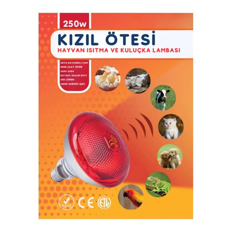 250W kızılötesi (infrared) ısıtıcı lamba, kuluçka, kümes ve hayvan ısıtma alanlarında yüksek verim sağlar. E27 kalın duy uyumlu tasarımıyla kolay montaj yapılabilir. Küçük alanlarda sobaya gerek kalmadan güçlü ısı üretir.