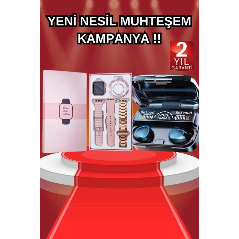 AKILLI SAATYeni Nesil Mini Kadın Akıllı Saat, şıklığı ve fonksiyonelliği bir araya getiren tasarımıyla kadınlar için ideal bir seçenek sunuyor. Almanya üretimi ultra dayanıklı model, özel wireless şarj özellikleriyle öne çıkıyor ve Türkçe menüsü sayesinde kullanıcı dostudur. Kutu içeriğinde, mini akıllı saat, 3 farklı kordon, hediye bileklik, wireless şarj kablosu ve kullanım kılavuzu bulunmaktadır. Şık pembe kutusu, hediye olarak tercih edilmesini sağlayan bir özellik taşır. 41 mm kavisli oval kenarlı yeni tasarımı ve 1,70 inç AMOLED ekranı ile yüksek çözünürlükte HD görüntü sağlar.Saat, nabız ölçer, uyku izleyici, kan basıncı, tansiyon, EKG ve vücut sıcaklığı ölçer gibi sağlık izleme özellikleriyle sağlığınızı takip etmenizi sağlar. 117 farklı spor modu ve adım, kalori, kalp ritmi ölçme gibi özellikler ile aktivite takibini oldukça detaylı yapabilirsiniz. Ayrıca akıllı hatırlatıcılar sayesinde su içme ve hareketsizlik gibi hatırlatmalar alabilir, tüm bildirimleri ve mesajları anında saatinizde görebilirsiniz.Bluetooth bağlantısı ile yüksek kaliteli müzik dinleyebilir ve uzaktan fotoğraf çekme özelliği ile fotoğraflarınızı kolayca çekebilirsiniz. Suya dayanıklı yapısı, günlük kullanımda sıklıkla tercih edilmesini sağlar; ancak deniz ve havuz gibi basınçlı suya karşı su geçirmez.Saatin sunduğu diğer özellikler arasında Türkçe ve çoklu dil desteği, saatimi bul, telefonumu bul, alarm, kronometre, hava durumu, hesap makinesi gibi fonksiyonlar bulunur. Kordonu değiştirilebilir, bu sayede kişisel tercihlere göre tasarımı özelleştirilebilir. 24 ay garanti süresi ile kullanıcılarına güvenli bir deneyim sunar.KULAKLIKYeni M10 Bluetooth Kulaklık, güçlü ses performansı ve çift mikrofon teknolojisi ile müzik dinlerken ve telefon görüşmeleri yaparken üstün bir deneyim sunar. Ses aktarımı sırasında gecikme yaşanmaz, bu da net ve kesintisiz iletişim sağlar. Süper 3D ses kalitesi, müzik dinlerken ses gecikmesini ortadan kaldırarak etkileyici bir performans sergiler. Spor ve egzersiz sırasında rahatça yerinde kalan tasarımı ile konforlu kullanım sunar.Yüksek kaliteli malzemelerle üretilen M10 kulaklık, dayanıklılığı ve ses kalitesiyle öne çıkar. Terlemeye dayanıklı ve su geçirmez özellikleri sayesinde uzun süreli kullanıma uygundur. Geliştirilmiş lithium polymer bataryası, kulaklıkla birlikte 16 saat kesintisiz müzik dinleme süresi sağlar.Tuşlu (manuel) kontrol sistemi, gelen aramaları kolayca cevaplamanızı ve sonlandırmanızı sağlar. Ayrıca, telefonunuzu elinize almadan ses seviyesini ayarlayabilir, müzik çalma listenizi ileri ve geri sarabilirsiniz. Tüm Android ve iOS cihazlarla uyumlu olan M10 Bluetooth kulaklık, evrensel bir modeldir.Kullanım oldukça basittir: Kulaklıkları powerbank adaptöründen çıkarın, telefonunuzun Bluetooth özelliğini açarak otomatik olarak bağlanın ve müziğinizin tadını çıkarın.