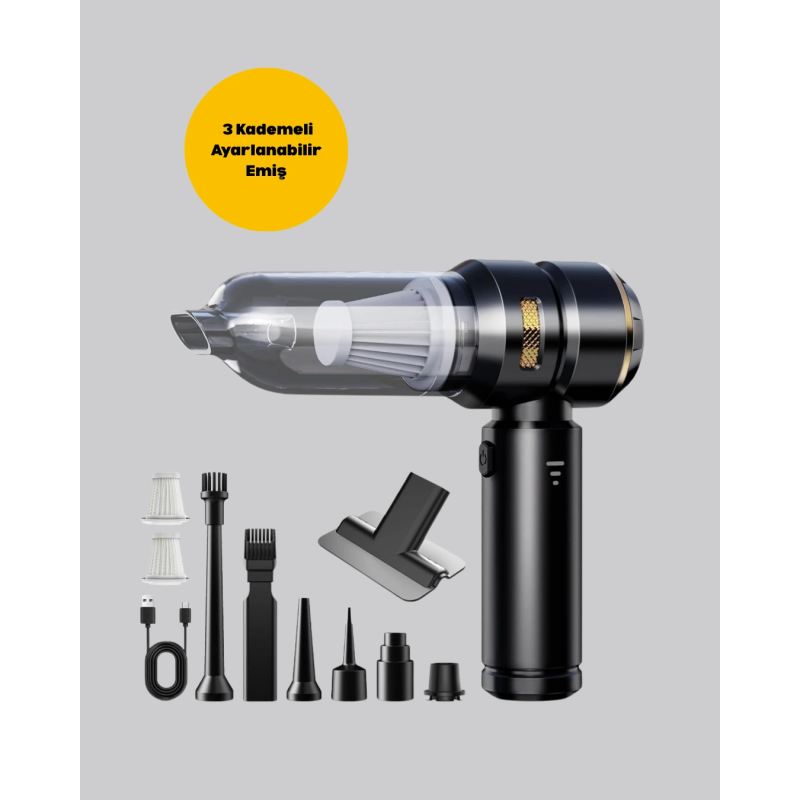 Şarjlı, kablosuz ve çok fonksiyonlu yapısıyla dikkat çeken bu araç içi süpürge, günlük temizlik rutinlerinizi daha kolay ve hızlı hale getiriyor. 2 in 1 fonksiyonuyla hem güçlü vakumlama hem de hava üfleme özelliklerini bir arada sunuyor. 15.000 PA emiş gücü, en küçük toz parçacıklarını bile etkili şekilde temizler. Üç farklı kademeli emiş seçeneği sayesinde kullanım alanınıza uygun performans elde edebilirsiniz. HEPA filtre sistemiyle toz ve partikülleri yüksek verimlilikle yakalarken yıkanabilir özelliğiyle uzun süreli ve hijyenik kullanım sunar. Geniş toz haznesi kolayca boşaltılabilir ve temizlenebilir. Kompakt ve hafif tasarımıyla hem taşınabilir hem de ergonomiktir. Uzun süreli kullanımlarda bile rahatlık sağlayan tutma kolu, temizlik işlerinizi keyifli hale getirir. Sessiz motor teknolojisi sayesinde gürültüsüz çalışır ve her ortamda kullanılabilir. Zengin aksesuar seti içerisinde dar ağızlı başlık, fırçalı başlık ve üfleme atı gibi seçenekler bulunur. Bu sayede aracınızın koltuk araları, döşemeleri, evinizdeki küçük alanlar, mobilya köşeleri ve daha pek çok alanı pratik bir şekilde temizleyebilirsiniz. Çok yönlü kullanımıyla hayatınızı kolaylaştıran bu süpürge, temizlik deneyiminizi profesyonel seviyeye taşır.