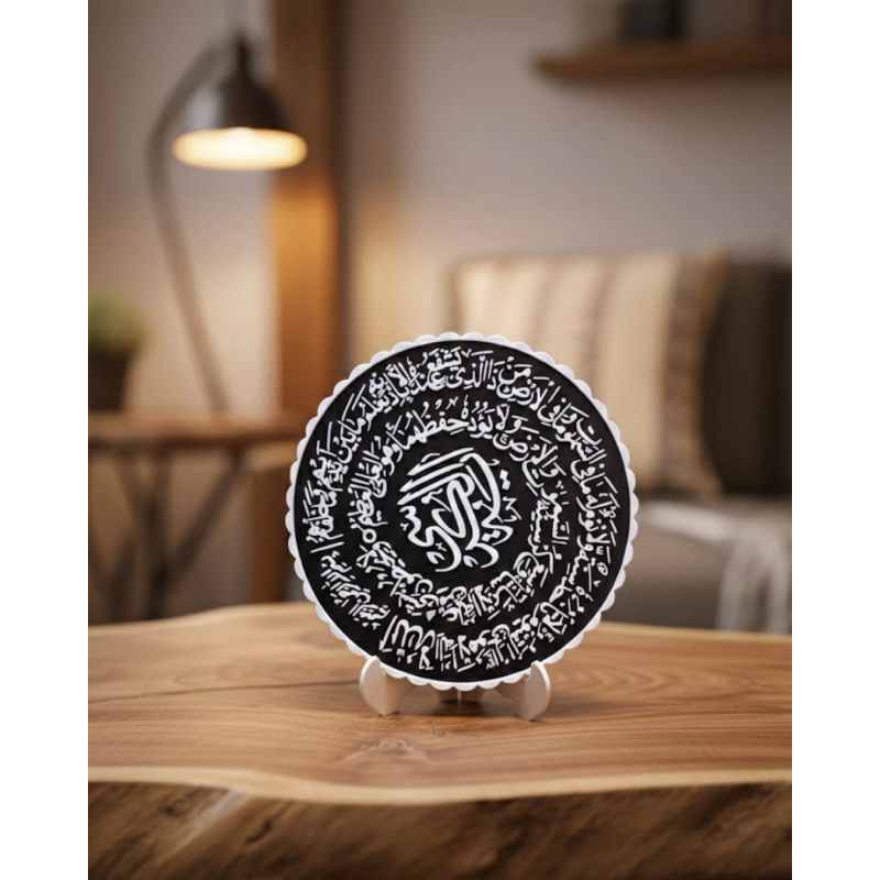 Modern hat tasarım anlayışıyla üretilmiş Ayetel Kürsi dekoratif pano, es ve anlamı bir araya getirir. Siyah zemin üzerindeki beyaz yazı tasarımı sayesinde net ve güçlü bir görünüm sunar.Yuvarlak formu sayesinde bulunduğu ortama yumuşak bir tasarım dili kazandırır. Yazıların dengeli yerleşimi ürünü görsel olarak zenginleştirir.Ev, ofis ve ibadet alanlarında kullanılabilecek şık bir dekoratif üründür. Özel günlerde hediye alternatifi olarak da tercih edilebilir.