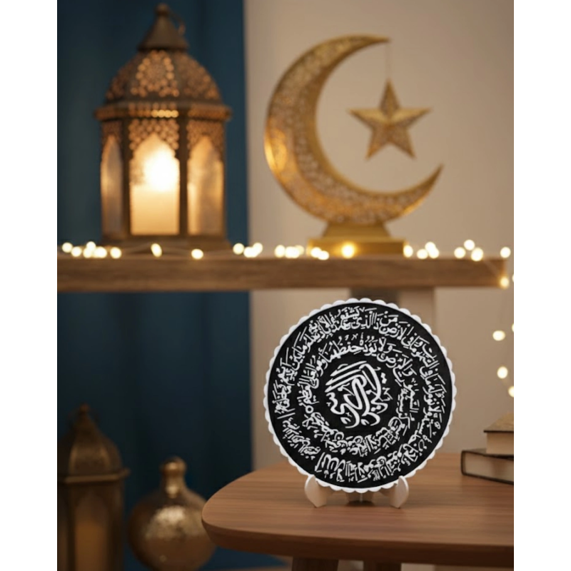 Ayetel Kürsi yazılı bu özel tasarım pano, bulunduğu ortama anlam katan şık bir dekor ürünüdür. Siyah zemin üzerine beyaz yazı tasarımı ile dikkat çekici bir görünüm sunar.Modern ve sade tasarımı sayesinde farklı dekor stilleri ile uyumludur. Standlı yapısı pratik kullanım sağlar.Anlamlı bir hediye alternatifi olarak da tercih edilebilir.