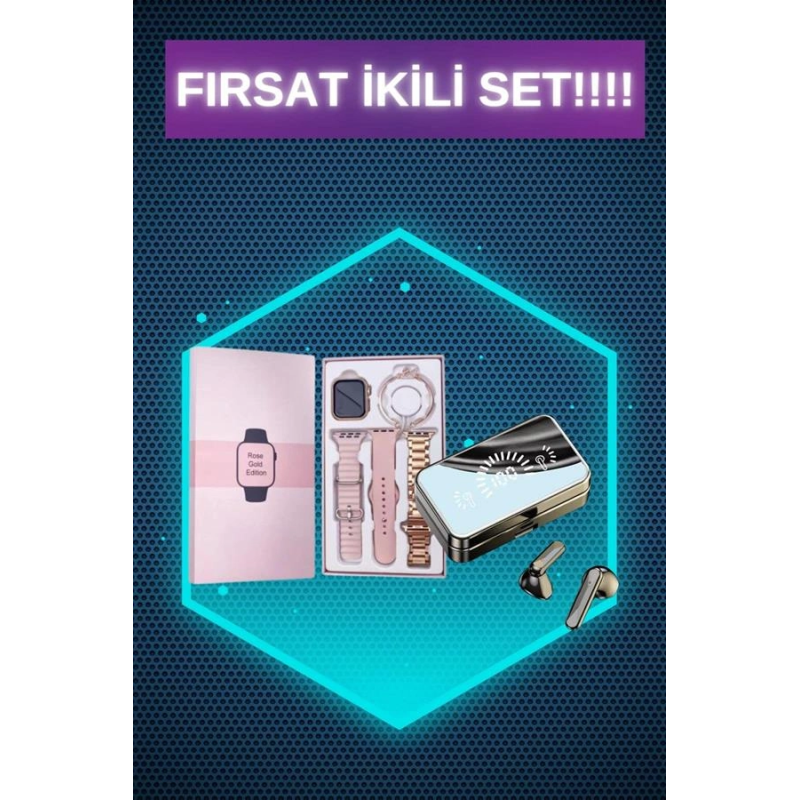 AKILLI SAATYeni Nesil Mini Kadın Akıllı Saat, şıklığı ve fonksiyonelliği bir araya getiren tasarımıyla kadınlar için ideal bir seçenek sunuyor. Almanya üretimi ultra dayanıklı model, özel wireless şarj özellikleriyle öne çıkıyor ve Türkçe menüsü sayesinde kullanıcı dostudur. Kutu içeriğinde, mini akıllı saat, 3 farklı kordon, hediye bileklik, wireless şarj kablosu ve kullanım kılavuzu bulunmaktadır. Şık pembe kutusu, hediye olarak tercih edilmesini sağlayan bir özellik taşır. 41 mm kavisli oval kenarlı yeni tasarımı ve 1,70 inç AMOLED ekranı ile yüksek çözünürlükte HD görüntü sağlar.Saat, nabız ölçer, uyku izleyici, kan basıncı, tansiyon, EKG ve vücut sıcaklığı ölçer gibi sağlık izleme özellikleriyle sağlığınızı takip etmenizi sağlar. 117 farklı spor modu ve adım, kalori, kalp ritmi ölçme gibi özellikler ile aktivite takibini oldukça detaylı yapabilirsiniz. Ayrıca akıllı hatırlatıcılar sayesinde su içme ve hareketsizlik gibi hatırlatmalar alabilir, tüm bildirimleri ve mesajları anında saatinizde görebilirsiniz.Bluetooth bağlantısı ile yüksek kaliteli müzik dinleyebilir ve uzaktan fotoğraf çekme özelliği ile fotoğraflarınızı kolayca çekebilirsiniz. Suya dayanıklı yapısı, günlük kullanımda sıklıkla tercih edilmesini sağlar; ancak deniz ve havuz gibi basınçlı suya karşı su geçirmez.Saatin sunduğu diğer özellikler arasında Türkçe ve çoklu dil desteği, saatimi bul, telefonumu bul, alarm, kronometre, hava durumu, hesap makinesi gibi fonksiyonlar bulunur. Kordonu değiştirilebilir, bu sayede kişisel tercihlere göre tasarımı özelleştirilebilir. 24 ay garanti süresi ile kullanıcılarına güvenli bir deneyim sunar.KULAKLIKTelefonu şarj etme özelliğine sahip olan bu kulaklık, çift dijital gösterge sayesinde pil seviyesini anlık olarak takip etme imkanı sunar. Güçlendirilmiş bass özelliği ile müzik deneyiminizi üst seviyeye taşırken, konuşmalarda gürültü önleyici fonksiyonu sayesinde sesinizin karşı tarafa net bir şekilde iletilmesini sağlar.Bluetooth 5.0 teknolojisi ile 10 metreye kadar kesintisiz bağlantı sunan kulaklık, IPX5 su geçirmezlik seviyesine sahip olan model, hafif su sıçramalarına karşı dayanıklıdır. 50mAh kulaklık pili ve 2000mAh şarj çantası ile donatılan ürün, 5-6 güne kadar kullanım süresi sunar. Yaklaşık 4-5 saat içinde tamamen şarj olan kulaklık, tekli veya çiftli kullanım modlarını destekler.Dokunmatik kontrol özellikleri sayesinde müzik çalma/duraklatma ve çağrı cevaplama işlemlerini kolayca gerçekleştirebilirsiniz. iOS güç göstergesi ve sesli komut istemi gibi ek fonksiyonlarla donatılmış olan bu model, şık siyah tasarımı ile dikkat çeker. Paket içeriğinde 2 adet Bluetooth kulaklık, 1 adet şarj kutusu, 1 adet şarj kablosu ve 1 adet kullanım kılavuzu bulunmaktadır.