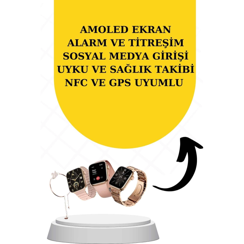 AKILLI SAATYeni Nesil Mini Kadın Akıllı Saat, şıklığı ve fonksiyonelliği bir araya getiren tasarımıyla kadınlar için ideal bir seçenek sunuyor. Almanya üretimi ultra dayanıklı model, özel wireless şarj özellikleriyle öne çıkıyor ve Türkçe menüsü sayesinde kullanıcı dostudur. Kutu içeriğinde, mini akıllı saat, 3 farklı kordon, hediye bileklik, wireless şarj kablosu ve kullanım kılavuzu bulunmaktadır. Şık pembe kutusu, hediye olarak tercih edilmesini sağlayan bir özellik taşır. 41 mm kavisli oval kenarlı yeni tasarımı ve 1,70 inç AMOLED ekranı ile yüksek çözünürlükte HD görüntü sağlar.Saat, nabız ölçer, uyku izleyici, kan basıncı, tansiyon, EKG ve vücut sıcaklığı ölçer gibi sağlık izleme özellikleriyle sağlığınızı takip etmenizi sağlar. 117 farklı spor modu ve adım, kalori, kalp ritmi ölçme gibi özellikler ile aktivite takibini oldukça detaylı yapabilirsiniz. Ayrıca akıllı hatırlatıcılar sayesinde su içme ve hareketsizlik gibi hatırlatmalar alabilir, tüm bildirimleri ve mesajları anında saatinizde görebilirsiniz.Bluetooth bağlantısı ile yüksek kaliteli müzik dinleyebilir ve uzaktan fotoğraf çekme özelliği ile fotoğraflarınızı kolayca çekebilirsiniz. Suya dayanıklı yapısı, günlük kullanımda sıklıkla tercih edilmesini sağlar; ancak deniz ve havuz gibi basınçlı suya karşı su geçirmez.Saatin sunduğu diğer özellikler arasında Türkçe ve çoklu dil desteği, saatimi bul, telefonumu bul, alarm, kronometre, hava durumu, hesap makinesi gibi fonksiyonlar bulunur. Kordonu değiştirilebilir, bu sayede kişisel tercihlere göre tasarımı özelleştirilebilir. 24 ay garanti süresi ile kullanıcılarına güvenli bir deneyim sunar.KULAKLIKTelefonu şarj etme özelliğine sahip olan bu kulaklık, çift dijital gösterge sayesinde pil seviyesini anlık olarak takip etme imkanı sunar. Güçlendirilmiş bass özelliği ile müzik deneyiminizi üst seviyeye taşırken, konuşmalarda gürültü önleyici fonksiyonu sayesinde sesinizin karşı tarafa net bir şekilde iletilmesini sağlar.Bluetooth 5.0 teknolojisi ile 10 metreye kadar kesintisiz bağlantı sunan kulaklık, IPX5 su geçirmezlik seviyesine sahip olan model, hafif su sıçramalarına karşı dayanıklıdır. 50mAh kulaklık pili ve 2000mAh şarj çantası ile donatılan ürün, 5-6 güne kadar kullanım süresi sunar. Yaklaşık 4-5 saat içinde tamamen şarj olan kulaklık, tekli veya çiftli kullanım modlarını destekler.Dokunmatik kontrol özellikleri sayesinde müzik çalma/duraklatma ve çağrı cevaplama işlemlerini kolayca gerçekleştirebilirsiniz. iOS güç göstergesi ve sesli komut istemi gibi ek fonksiyonlarla donatılmış olan bu model, şık siyah tasarımı ile dikkat çeker. Paket içeriğinde 2 adet Bluetooth kulaklık, 1 adet şarj kutusu, 1 adet şarj kablosu ve 1 adet kullanım kılavuzu bulunmaktadır.