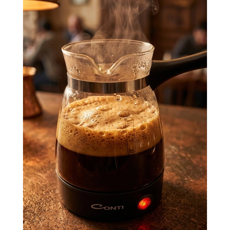 Elektrikli cam kahve makinesi, geleneksel Türk kahvesi hazırlama yöntemini modern teknoloji ile birleştiren kullanışlı bir mutfak cihazıdır. Ocak kullanmadan kısa sürede kahve hazırlamaya imkan sağlayan bu ürün, özellikle yoğun tempoda yaşayan kullanıcılar için oldukça pratik bir çözüm sunar.650W gücünde çalışan motoru sayesinde kısa sürede kahve hazırlayabilir ve köpüklü Türk kahvesi keyfini hızlı şekilde yaşayabilirsiniz. Cam cezve yapısı sayesinde kahve hazırlanırken oluşan köpük ve kaynama süreci rahatlıkla görülebilir. Bu özellik kahve hazırlama deneyimini daha keyifli hale getirir.0.5 litre kapasitesi sayesinde aynı anda 5 fincana kadar Türk kahvesi hazırlamak mümkündür. Bu özellik özellikle misafir ağırlarken veya kalabalık ortamlarda kahve hazırlarken büyük avantaj sağlar.Ergonomik sap tasarımı sayesinde cezveyi rahat şekilde kavrayabilir ve kahveyi kolayca servis edebilirsiniz. Isıya dayanıklı sap yapısı güvenli kullanım sunar ve dökme işlemini daha rahat hale getirir.Cam kahve makinesi, modern mutfaklarda hem fonksiyonel hem de es bir ürün olarak tercih edilmektedir. Şık tasarımı sayesinde mutfak tezgahında dekoratif bir görünüm de oluşturur.Pratik kullanımı, hızlı kahve hazırlama özelliği ve kolay temizlenebilir cam yapısı sayesinde bu kahve makinesi günlük kullanım için ideal bir seçenektir. Türk kahvesi severler için hem pratik hem de keyifli bir kahve hazırlama deneyimi sunar.