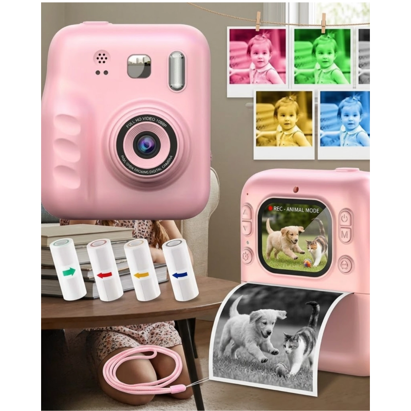 Bu çocuk fotoğraf makinesi, eğlence ve öğrenmeyi bir araya getiren özel bir üründür. Fotoğraf çekme, video kaydetme ve anında baskı özellikleri ile çocukların ilgisini çekerken, yanında sunulan 4 rulo baskı kağıdı ve 5 adet renkli kalem hediyesi ile kullanım deneyimini üst seviyeye taşır.Çocuklar çektikleri fotoğrafları anında çıktı alabilir ve bu çıktıları boyayarak kişiselleştirebilir. Bu özellik hem eğlenceli hem de eğitici bir deneyim sunar. Termal baskı teknolojisi sayesinde mürekkep gerekmez ve bu sayede uzun vadede tasarruf sağlar.Kamera, HD ekranı ile çekilen görüntüleri net bir şekilde gösterir. Kullanımı oldukça basittir ve çocukların tek başına rahatlıkla kullanabileceği şekilde tasarlanmıştır. Fotoğraf ve video modları arasında hızlı geçiş yapılabilir.Ön ve arka kamera desteği sayesinde çocuklar hem kendilerini hem de çevrelerini fotoğraflayabilir. Bu da onların sosyal ve yaratıcı yönlerini geliştirmelerine katkı sağlar.Hafif ve taşınabilir yapısı sayesinde her yere götürülebilir. Parkta, tatilde veya evde rahatlıkla kullanılabilir. Hafıza kart desteği ile içerikler saklanabilir ve aktarılabilir.Dayanıklı yapısı ile çocuk kullanımına uygun olan bu ürün, uzun süreli kullanım sunar. Yanında gelen hediyeler ile birlikte oldukça avantajlı bir seçenektir.