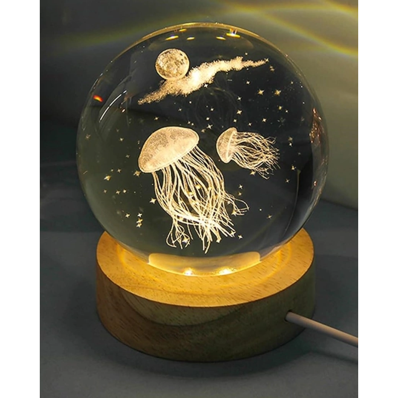 Dekoratif Deniz Anası Tasarımlı Ahşap Altlıklı Işıklı Cam Küre Büyük Boy Cam:8cm Ahşap:2cm
