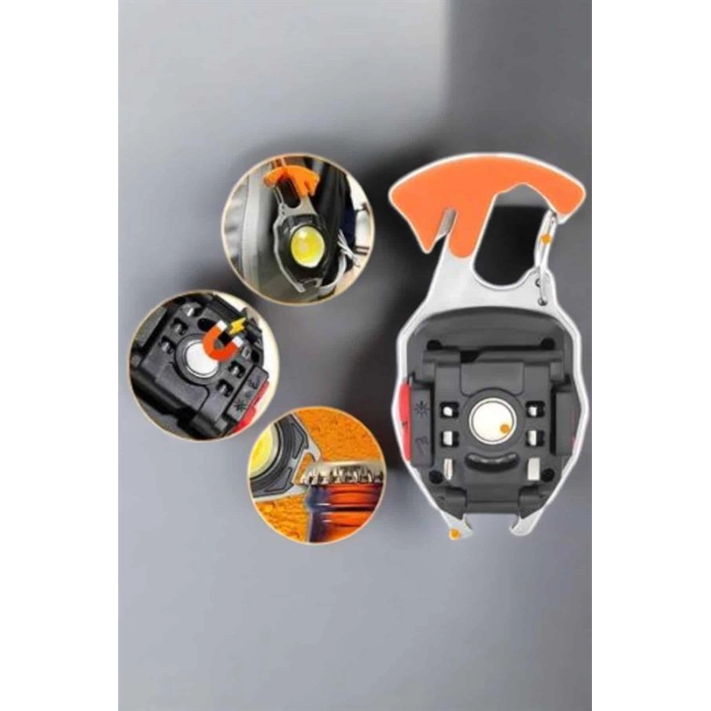 Zorlu koşullara uygun olarak tasarlanan bu çok işlevli anahtarlık feneri, yalnızca bir fenerden çok daha fazlasını sunar. Ultra parlak LED ışığı ile karanlık ortamlarda dahi maksimum görüş sağlar ve güvenliğinizi artırır. Acil durumlarda kullanabileceğiniz entegre düdük, doğa yürüyüşlerinde veya kamp yaparken hayat kurtarıcı bir detay olarak öne çıkar. Ayrıca, şişe açacağı ve tornavida gibi pratik araçlar, günlük kullanımda da size büyük kolaylık sağlar. USB üzerinden şarj edilebilen bataryası, çevre dostu bir çözüm sunarken sizi pil değiştirme zahmetinden kurtarır. Çoklu ışık modları sayesinde her duruma uygun bir aydınlatma seçeneği sunan bu ürün, taşınabilir ve hafif tasarımıyla her zaman yanınızda olmaya hazırdır. Açık hava etkinliklerinden günlük yaşamınıza kadar her alanda pratik çözümler sunan bu anahtarlık feneri, kompakt boyutuyla büyük işler başarır. Şimdi satın alın, her duruma hazırlıklı olun!
