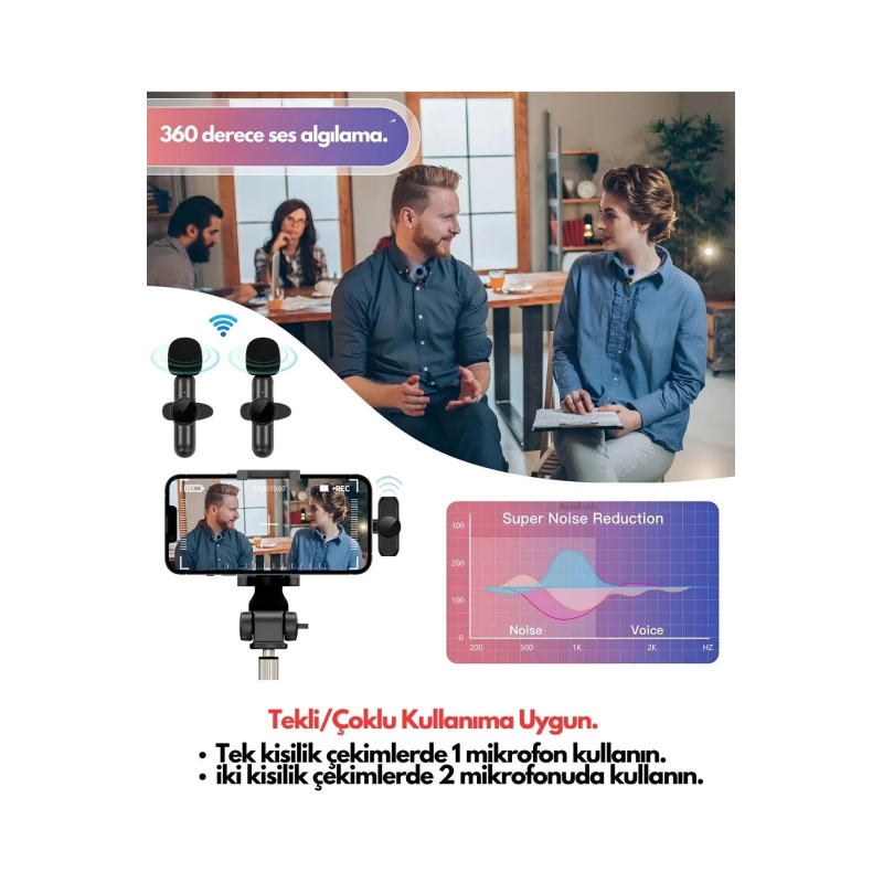 Kablosuz İkili Yaka Mikrofon Seti – Android ve iOS Uyumlu, Tak Çalıştır, Gürültü Engelleme Özellikli