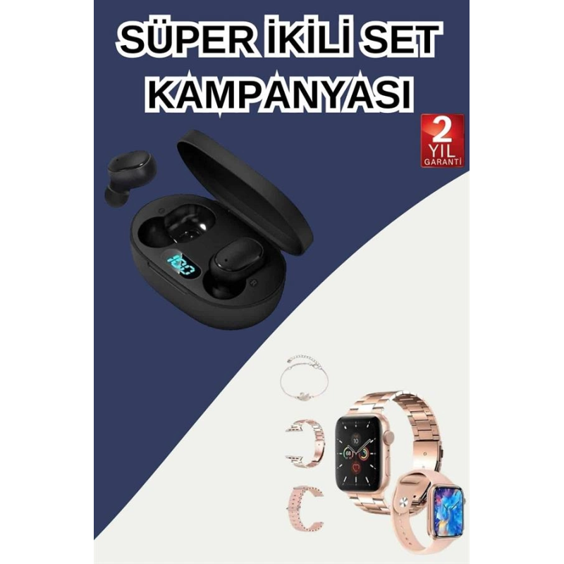AKILLI SAATYeni Nesil Mini Kadın Akıllı Saat, şıklığı ve fonksiyonelliği bir araya getiren tasarımıyla kadınlar için ideal bir seçenek sunuyor. Almanya üretimi ultra dayanıklı model, özel wireless şarj özellikleriyle öne çıkıyor ve Türkçe menüsü sayesinde kullanıcı dostudur. Kutu içeriğinde, mini akıllı saat, 3 farklı kordon, hediye bileklik, wireless şarj kablosu ve kullanım kılavuzu bulunmaktadır. Şık pembe kutusu, hediye olarak tercih edilmesini sağlayan bir özellik taşır. 41 mm kavisli oval kenarlı yeni tasarımı ve 1,70 inç AMOLED ekranı ile yüksek çözünürlükte HD görüntü sağlar.Saat, nabız ölçer, uyku izleyici, kan basıncı, tansiyon, EKG ve vücut sıcaklığı ölçer gibi sağlık izleme özellikleriyle sağlığınızı takip etmenizi sağlar. 117 farklı spor modu ve adım, kalori, kalp ritmi ölçme gibi özellikler ile aktivite takibini oldukça detaylı yapabilirsiniz. Ayrıca akıllı hatırlatıcılar sayesinde su içme ve hareketsizlik gibi hatırlatmalar alabilir, tüm bildirimleri ve mesajları anında saatinizde görebilirsiniz.Bluetooth bağlantısı ile yüksek kaliteli müzik dinleyebilir ve uzaktan fotoğraf çekme özelliği ile fotoğraflarınızı kolayca çekebilirsiniz. Suya dayanıklı yapısı, günlük kullanımda sıklıkla tercih edilmesini sağlar; ancak deniz ve havuz gibi basınçlı suya karşı su geçirmez.Saatin sunduğu diğer özellikler arasında Türkçe ve çoklu dil desteği, saatimi bul, telefonumu bul, alarm, kronometre, hava durumu, hesap makinesi gibi fonksiyonlar bulunur. Kordonu değiştirilebilir, bu sayede kişisel tercihlere göre tasarımı özelleştirilebilir. 24 ay garanti süresi ile kullanıcılarına güvenli bir deneyim sunar.KULAKLIKKulak içi Bluetooth kulaklık, yüksek ses kalitesi ve stereo etkisi ile müzik ve görüşmelerde üstün bir deneyim sunar. Sadece 1 saatte tamamen şarj olan kablosuz kulaklık, hızlı şarj özelliği sayesinde vakitten tasarruf etmenizi sağlar. Siyah renkli tasarımı ve kulağa tam oturan yumuşak sünger detayları ile konforlu bir kullanım sunarken, 12 metre çalışma mesafesiyle 4 saat boyunca kesintisiz kullanım imkanı tanır.LED ışıklı uyarı sistemi sayesinde düşük pil, bağlantı durumu ve kullanım aşamaları hakkında kırmızı, yeşil ve mavi renklerle kullanıcıyı bilgilendirir. Terlemeye dayanıklı ve su geçirmez yapısı ile günlük aktivitelerinizde rahatlıkla kullanılabilir. Android ve iOS cihazlarla tam uyumlu olan bu kulaklık, açıldığında otomatik olarak bağlanarak kullanımı kolaylaştırır.Mini boyutları sayesinde çanta ve cepte kolayca taşınabilen kulaklık, tuşlu kontrol sistemi ile telefonunuza dokunmadan ses açma-kapama, gelen aramaları yanıtlama ve sonlandırma gibi işlemleri pratik bir şekilde yapmanızı sağlar. Lithium polymer bataryası ile 4 saat boyunca kesintisiz müzik keyfi sunan kulaklık, extra bass ve HD ses desteği ile yüksek kaliteli ses aktarımı gerçekleştirir. Çift mikrofonlu yapısı sayesinde net ve kesintisiz görüşmeler sağlarken, gürültü kesme özelliği sayesinde dış sesleri en aza indirerek daha berrak bir dinleme deneyimi sunar. 3D ses kalitesi ile gecikmeyi önleyerek yüksek performans sergileyen bu model, üstün özellikleriyle kullanıcılarına kaliteli ve konforlu bir kullanım imkanı sunuyor.