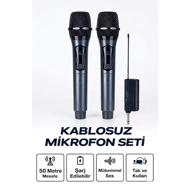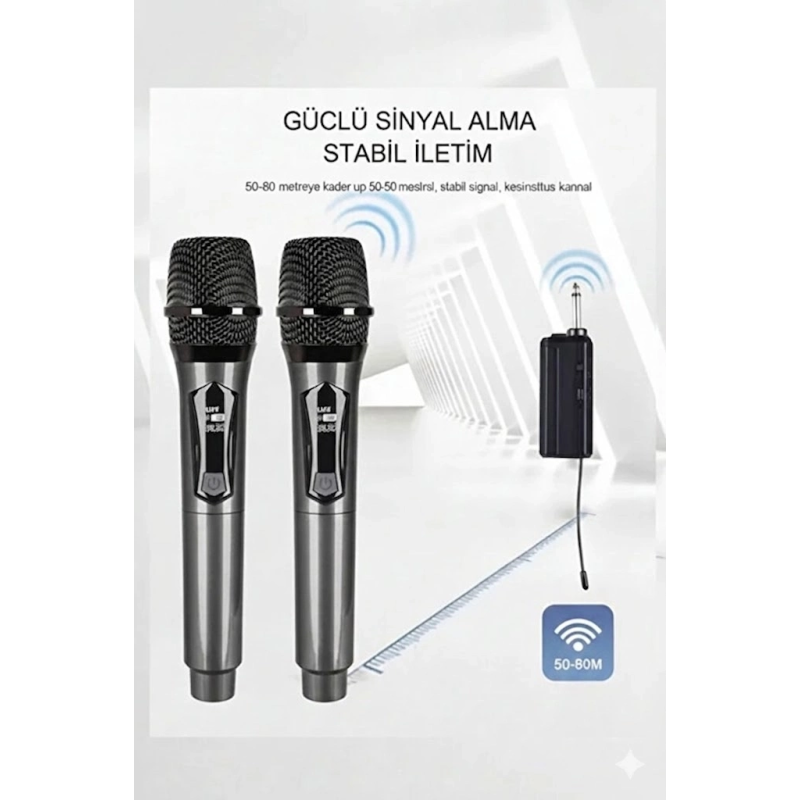 Profesyonel Çiftli Kablosuz Mikrofon Seti Karaoke Şarj Edilebilir 50 Metre