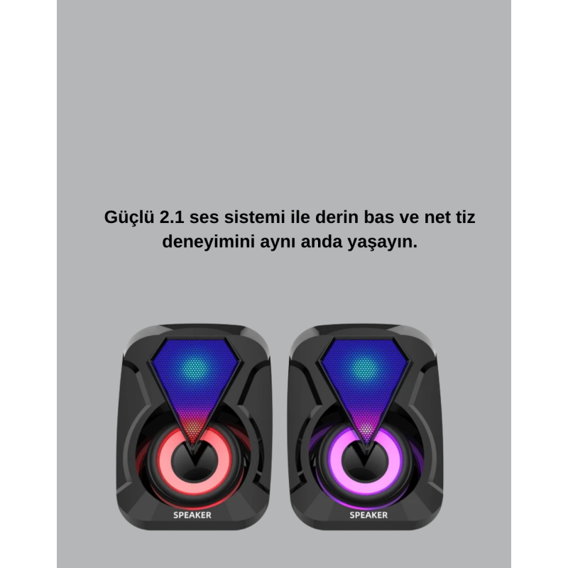 Renkli LED ışıklı USB 2.1 hoparlör, oyun ve müzik deneyiminizi görsel ve işitsel açıdan daha keyifli hale getirir. 1 subwoofer ve 2 uydu hoparlörden oluşan set, toplam 9W çıkış gücü ile güçlü bir performans sunar.Tam frekanslı titreşimli sürücüler sayesinde derin bas, zengin orta sesler ve net tizleri bir arada deneyimleyebilirsiniz. Arka bas trompet tasarımı, bas sesleri daha tok hale getirir.RGB LED ışık sistemi 7 farklı renk efekti ile müziğin ritmine uyum sağlar. Bu özellik oyun severler için atmosferi daha eğlenceli hale getirir.USB üzerinden güç alan cihaz, laptop, masaüstü bilgisayar, cep telefonu, MP3/MP4 çalar gibi birçok cihazla uyumludur.Plastik gövdesi dayanıklı, ölçüleri ise kompakt olup masaüstünde az yer kaplar. Oyun efektleri desteği sayesinde oyunculara daha gerçekçi bir deneyim sunar.Modern tasarımı, güçlü ses performansı ve LED ışık desteğiyle bu hoparlör seti, hem günlük kullanım hem de eğlence için ideal bir tercihtir.