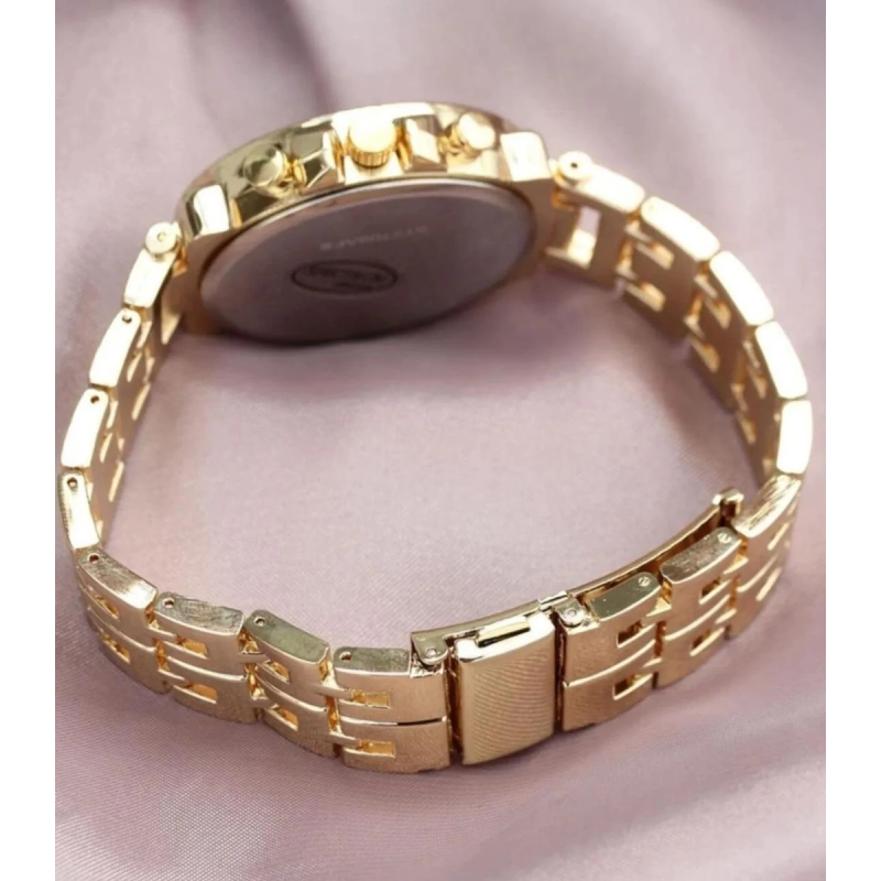 Tasarım: Saat kadranı zarif ve minimal bir stile sahiptir. Gold rengi kadranı, saate şık bir görünüm kazandırır. Zirkon taşlar, kadranın etrafını süsleyerek saatin daha da çarpıcı ve lüks bir görünüm kazanmasını sağlar.