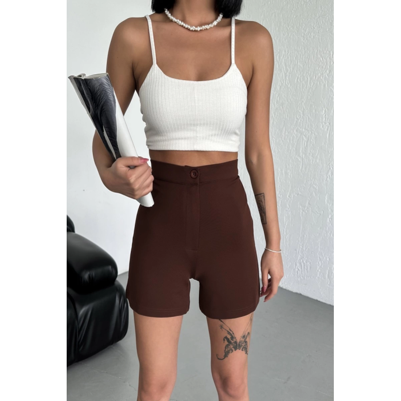 Tarz Ve Rahatlığı Bir Arada Sunan Yüksek Bel Esnek Likralı Krep Şort Kahverengi