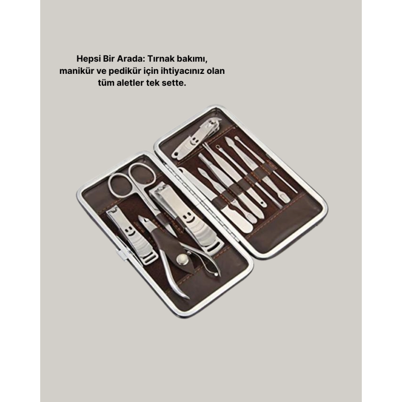 Evde kişisel bakım yapmayı kolaylaştıran 12 parça bakım seti, özel deri çantası ve paslanmaz çelikten üretilmiş dayanıklı aletleri ile her zaman yanınızda taşıyabileceğiniz pratik bir üründür. Set, el ve ayak bakımınızı eksiksiz şekilde yapabilmeniz için özenle hazırlanmıştır. İçerisinde kulak çekme atı, çok amaçlı makas, manikür makası, üç farklı tırnak makası/düzeltici, pense, kaş cımbızı, kir temizleme atı, tırnak törpüsü, manikür bıçağı ve akne iğnesi bulunur. Bu sayede yalnızca tırnaklarınızı değil, aynı zamanda cildinizi ve kaşlarınızı da kolayca şekillendirebilirsiniz. Taşınabilir boyutu sayesinde çantanızda kolayca yer bulur ve seyahatlerinizde yanınızda taşıyabilirsiniz. Hijyenik yapısı sayesinde aletler kolayca temizlenir, uzun süre güvenle kullanılabilir. Es deri çantası, aletlerin düzenli kalmasını sağlarken aynı zamanda şık bir görünüme sahiptir. Hem kadınların hem de erkeklerin kullanımına uygun olan bu set, kişisel bakımına özen gösteren herkesin ihtiyacını karşılar. Ayrıca özel günlerde hediye olarak da tercih edilebilecek çok yönlü bir üründür.