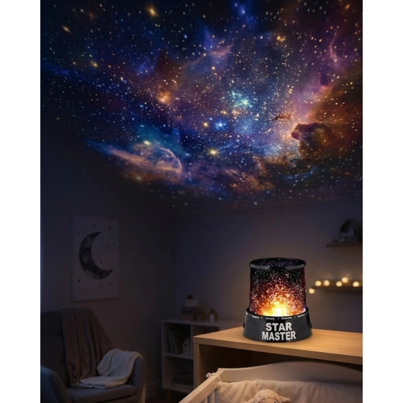 Renk değiştiren yıldız projektör gece lambası, odanızı büyüleyici yıldız ışıklarıyla aydınlatan dekoratif bir aydınlatma çözümüdür. Tavana ve duvarlara yansıyan yıldız efektleri sayesinde ortamda galaksi görünümü oluşur.LED ışık teknolojisi sayesinde enerji tasarruflu çalışır ve uzun süreli kullanım sunar. Işık renkleri otomatik olarak değişerek ortamda görsel bir zenginlik oluşturur.Ürün hem USB bağlantısı ile hem de pille çalışabilir. Bu sayede kullanım açısından oldukça esnektir ve farklı ortamlarda rahatlıkla kullanılabilir.Çocuk odası, yatak odası veya romantik dekorasyonlar için ideal bir gece lambasıdır.
