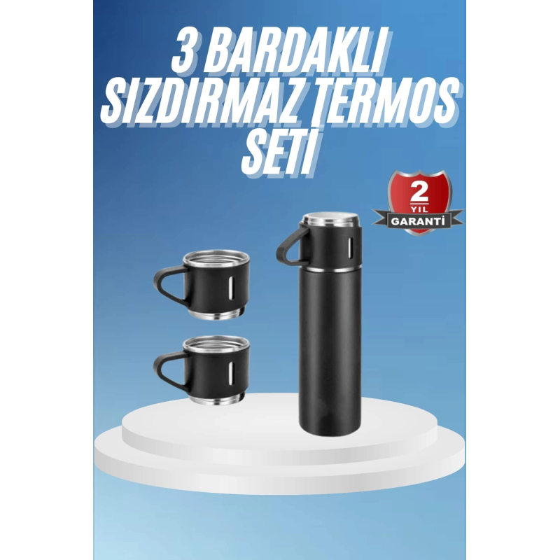 Termos Paslanmaz Çelik Termos Siyah Renk 3 Bardaklı Termos Seti