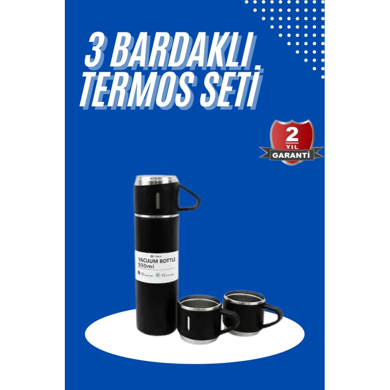 Termos Seti 3'lü Bardak Seti Isı Dayanıklı Siyah Paslanmaz Çelik Vakumlu