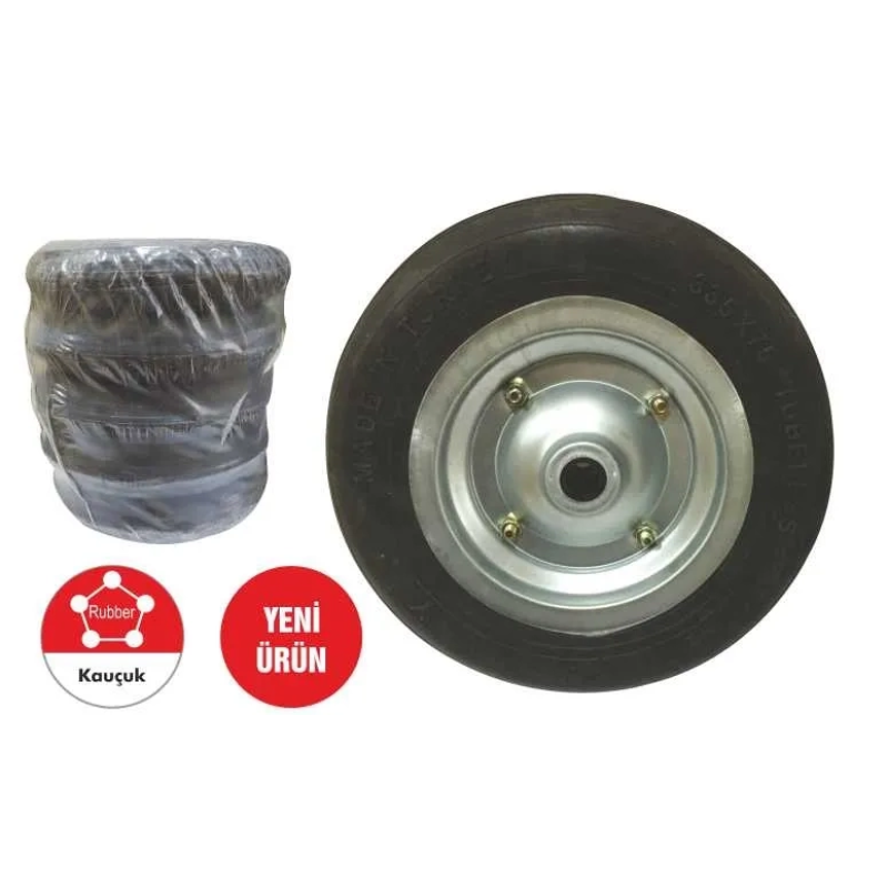 TKR 001 El Arabası Tekeri, el arabalarınız için uzun ömürlü ve güvenilir bir çözüm sunar. Dolgu yapısı sayesinde patlama riski ortadan kalkar ve zorlu zeminlerde bile üstün performans gösterir. Burçlu tasarımı ise tekerleğin kolayca monte edilmesini sağlar.