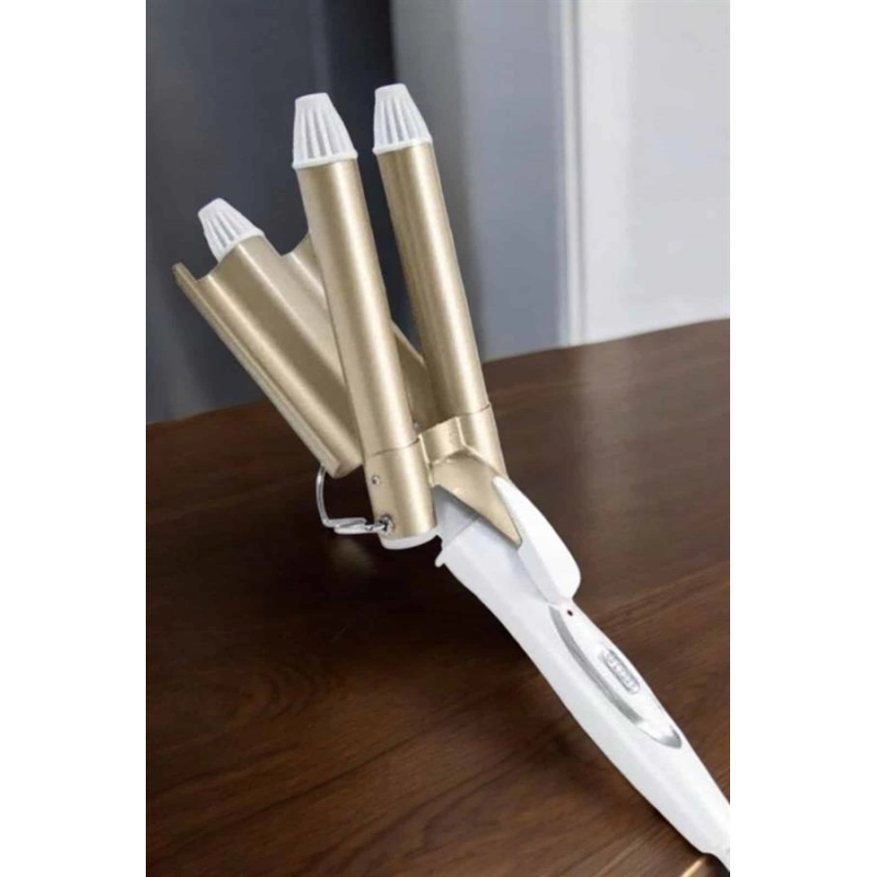 Seramik kaplama teknolojisiyle üretilen bu saç maşası, saçınıza zarar vermeden profesyonel sonuçlar elde etmenize yardımcı olur. Negatif iyon salınımı sayesinde saçtaki elektriklenmeyi azaltır ve doğal parlaklığı korur. 25 mm çapında üç namlulu tasarımı, orta ve uzun saçlarda hacimli ve kalıcı bukleler oluşturur. Hızlı ısınan PTC ısıtma sistemi, 30 saniye içinde 170°C'ye ulaşarak zamandan tasarruf etmenizi sağlar. Ayrıca 220°C'ye kadar ayarlanabilir sıcaklık kontrolü, farklı saç tipleri ve şekillendirme ihtiyaçlarına uygunluk sunar. Kaymaz tutamaç, ısı yalıtımlı ön braket ve haşlanma önleyici üst tasarımıyla güvenli ve pratik bir kullanım deneyimi sağlar. Altın rengi modern tasarımı ile şıklık ve işlevselliği bir arada sunar.