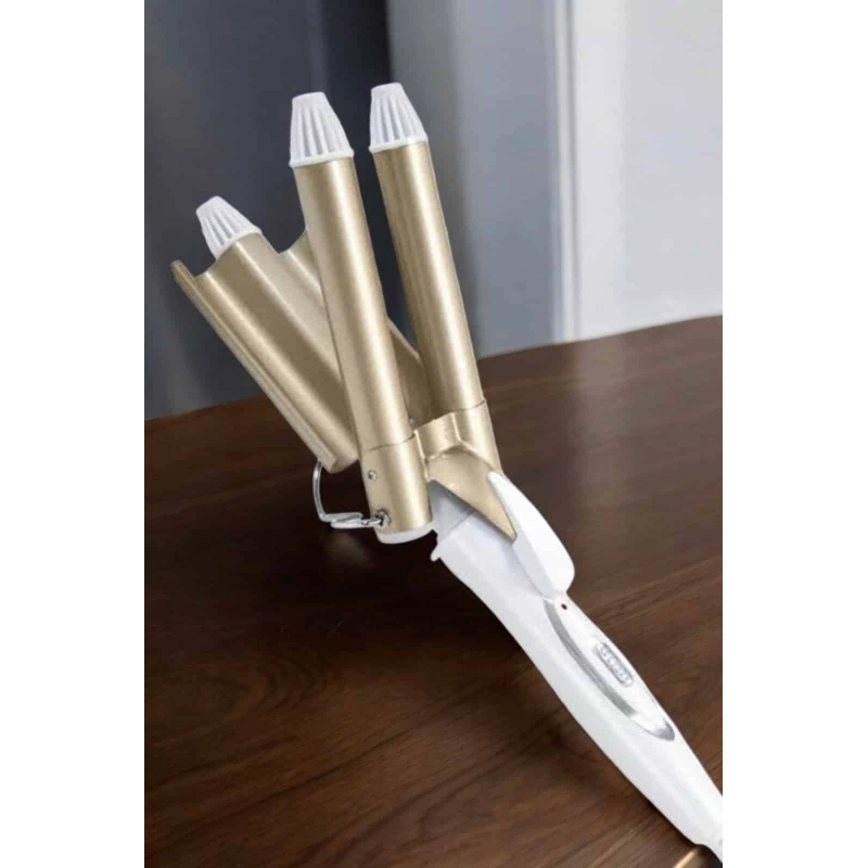 Seramik kaplama teknolojisiyle üretilen bu saç maşası, saçınıza zarar vermeden profesyonel sonuçlar elde etmenize yardımcı olur. Negatif iyon salınımı sayesinde saçtaki elektriklenmeyi azaltır ve doğal parlaklığı korur. 25 mm çapında üç namlulu tasarımı, orta ve uzun saçlarda hacimli ve kalıcı bukleler oluşturur. Hızlı ısınan PTC ısıtma sistemi, 30 saniye içinde 170°C'ye ulaşarak zamandan tasarruf etmenizi sağlar. Ayrıca 220°C'ye kadar ayarlanabilir sıcaklık kontrolü, farklı saç tipleri ve şekillendirme ihtiyaçlarına uygunluk sunar. Kaymaz tutamaç, ısı yalıtımlı ön braket ve haşlanma önleyici üst tasarımıyla güvenli ve pratik bir kullanım deneyimi sağlar. Altın rengi modern tasarımı ile şıklık ve işlevselliği bir arada sunar.