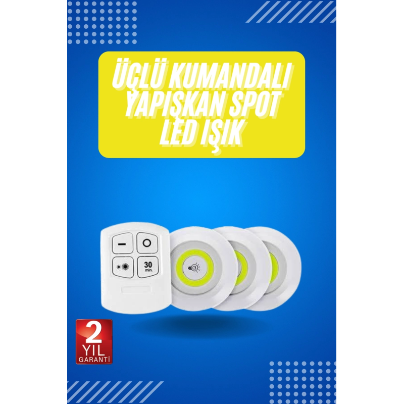 Yapışkanlı 3'lü Spot Led Işık Lamba Montajsız Pilli Uzaktan Kumandalı