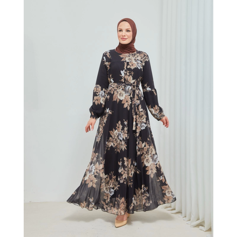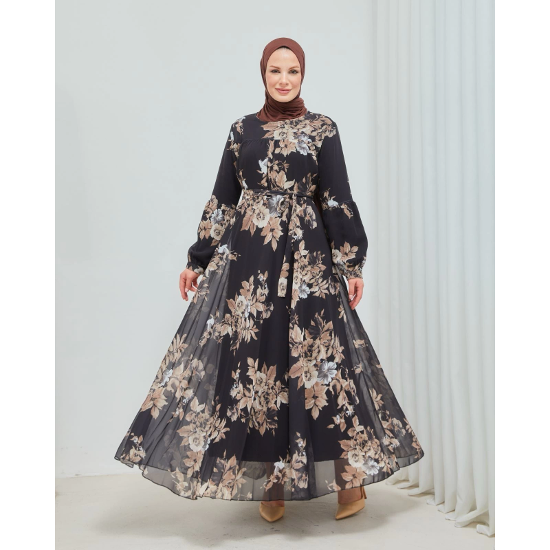Yaprak Desenli Zarif ve Şık Uzun Boy Büyük Beden Astarlı Şifon Elbise