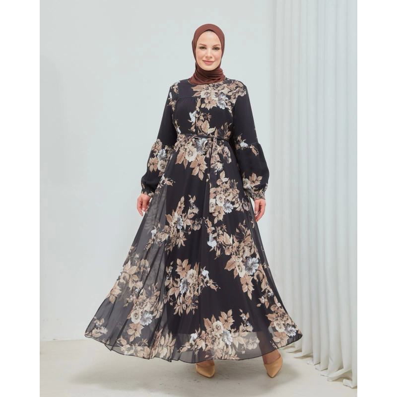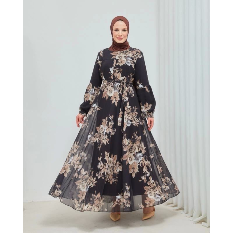 Yaprak Desenli Zarif ve Şık Uzun Boy Büyük Beden Astarlı Şifon Elbise