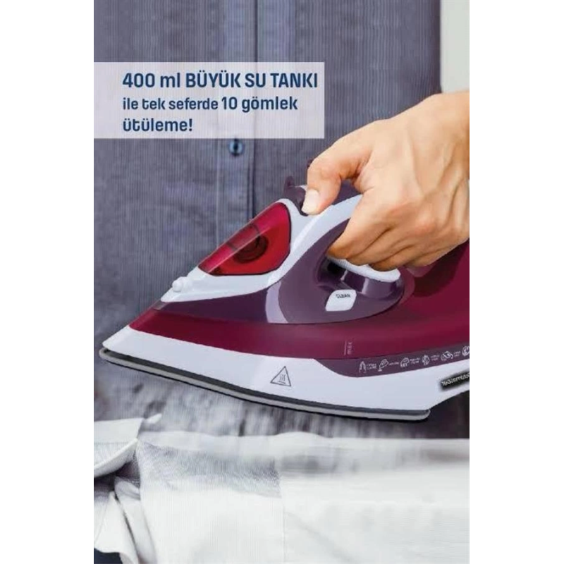 Es tasarımı ve yüksek performansı ile öne çıkan bu mor seramik tabanlı buharlı ütü, ütü yapmayı hem hızlı hem de verimli hale getiriyor. 2200W gücü sayesinde kısa sürede ısınarak güçlü buhar çıkışı sağlar. 177 gr/dk şok buhar performansı, kalın kumaşlar ve zorlu kırışıklıklarla başa çıkmak için ideal olup, her türlü giysiyi kolayca düzleştirir. Bu yüksek buhar gücü, zamandan tasarruf sağlar ve ütü işlemini daha kısa sürede tamamlamanıza yardımcı olur.Seramik taban, mükemmel kayma sağlar ve kumaş yüzeylerinde pürüzsüz bir geçiş sunarak ütüleme işlemini zahmetsiz hale getirir. Dikey ütüleme fonksiyonu, perde ve askıdaki kıyafetler gibi zorlu alanlarda bile rahat kullanım imkânı tanır. Ütü sırasında su damlamasını engelleyen damlama önleme sistemi sayesinde lekelerden kaçınarak daha temiz ve düzgün bir ütüleme elde edebilirsiniz. Kireçlenmeyi önleyen sistem, özellikle kireçli su kullanılan bölgelerde cihazın ömrünü uzatarak daha verimli çalışmasını sağlar.Kendi kendini temizleme özelliği, ütü bakımını oldukça kolaylaştırır. Böylece düzenli temizlik ve bakım işlemleri ile ütünüz her zaman maksimum performansla çalışır. 360 derece dönebilir kablosu ise rahat bir kullanım sağlar ve ütüleme işlemi sırasında daha fazla manevra kabiliyeti sunar. Modern tasarımı ve işlevsel özellikleri ile bu buharlı ütü, hem şıklığı hem de pratikliği bir arada sunar.Gelişmiş teknolojisi ve kullanıcı dostu özellikleri ile bu ütü, günlük ütü ihtiyaçlarınızı hızlı, verimli ve keyifli bir hale getirir. Hem es hem de işlevsel bir seçenek arayanlar için ideal bir üründür.