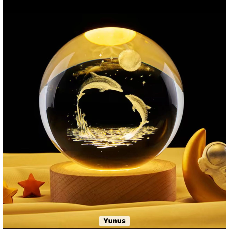 Kristal yüzeyin parlaklığı ve içindeki lazer oyma yunus deseni üstün işçilikle hazırlanmıştır. Ahşap taban, doğal dokusuyla ürünü hem dayanıklı hem de es hale getirir. Işık açıkken büyüleyici, ışık kapalıyken bile zarif bir dekoratif obje olarak kullanılabilir. Uzun ömürlü LED ışığıyla kaliteli bir kullanım deneyimi sunar.