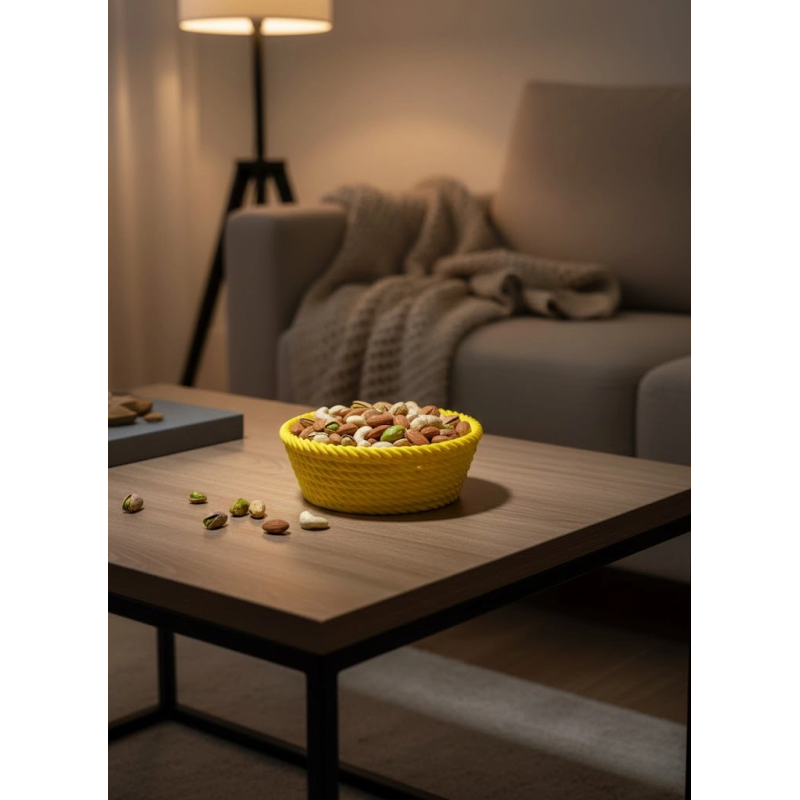 Yuvarlak Çerezlik Sarı 4×12 cm ölçüsüyle salon ve masa üstü sunumlar için ideal boyutta tasarlanmıştır. Canlı sarı rengi sayesinde bulunduğu ortama enerji ve sıcaklık katar. Özellikle loş ve sıcak salon aydınlatmalarında dikkat çekici bir dekoratif unsur olarak öne çıkar.Örgü dokulu tasarımı ürüne modern ve es bir görünüm kazandırır. Çerez, kuru yemiş, draje, şekerleme ve küçük atıştırmalıkların sunumu için uygundur. Kompakt yapısı sayesinde sehpa, orta masa ve raf üstlerinde düzenli bir görünüm sağlar.Hem günlük kullanım hem de misafir ağırlama anlarında pratiklik sunar. Minimal ölçüleriyle fazla yer kaplamaz ve masa düzenini bozmadan şık bir sunum imkânı tanır. Sarı rengiyle modern, bohem ve sade dekorasyon stilleriyle uyum sağlar.