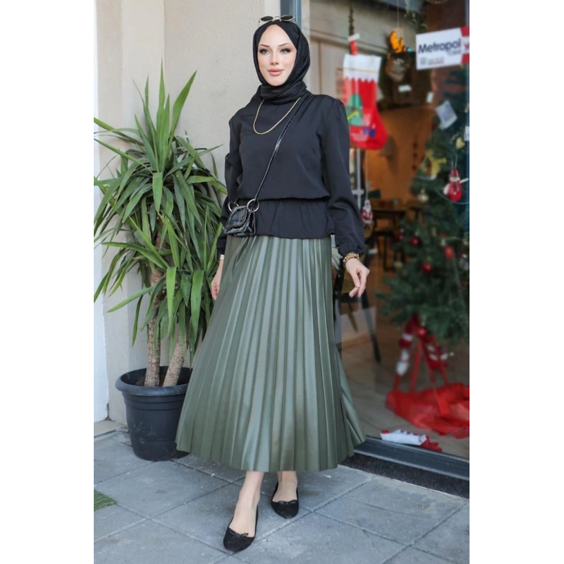 Zarif Ve Modern Pileli Parlak Krep Gizli Lastikli Haki Etek