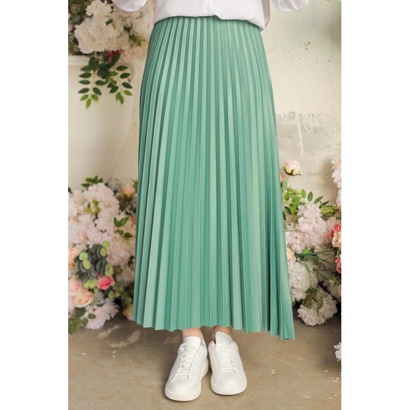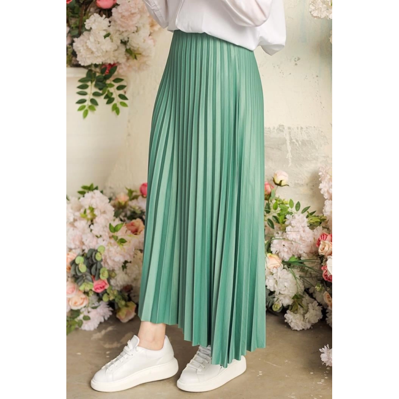 Zarif Ve Modern Pileli Parlak Krep Gizli Lastikli Mint Etek
