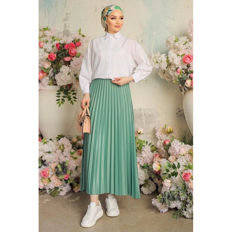 -Pileli detaylar, eteğe hareket ve hacim katarken aynı zamanda feminen bir dokunuş sağlar. Bu detaylar, eteğin tarzını ve çekiciliğini artırır, böylece her kombinde dikkat çekici bir seçenek haline gelir. Mint rengi, ferahlık ve enerjiyi simgelerken, aynı zamanda modern bir tarzı da yansıtır.