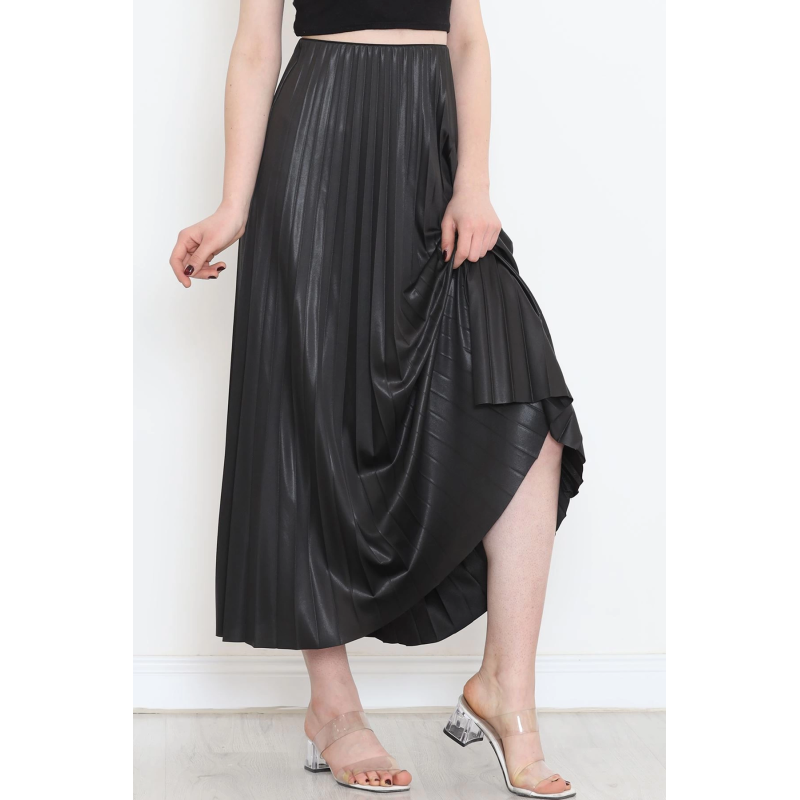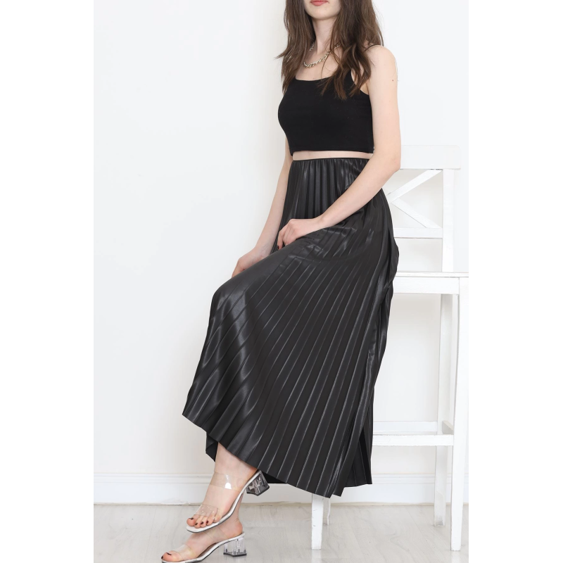 Zarif Ve Modern Pileli Parlak Krep Gizli Lastikli Siyah Etek
