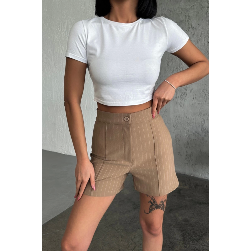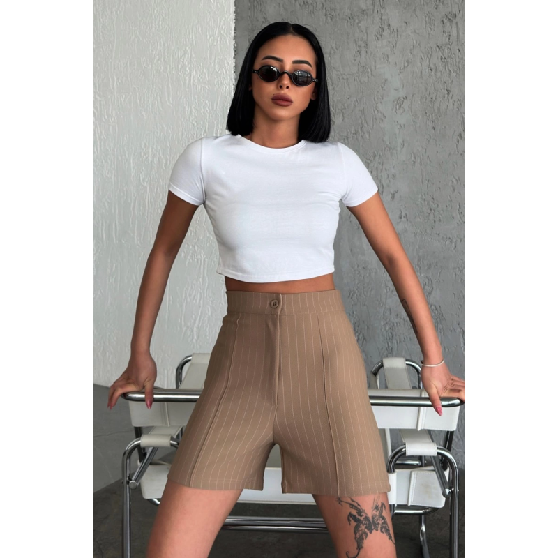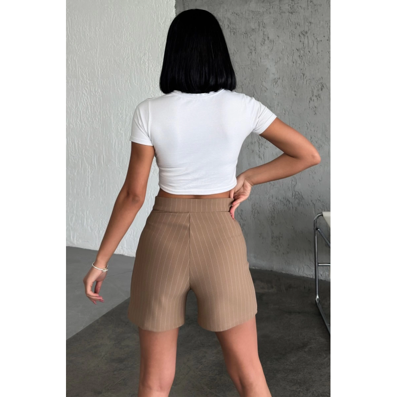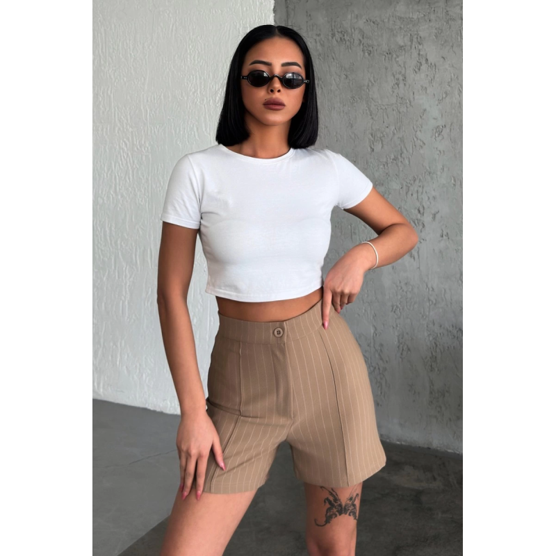 Zarif Ve Şıklığı Bir Arada Sunan Yüksek Bel Krep Esnek Çimalı Çizgili Şort Bej